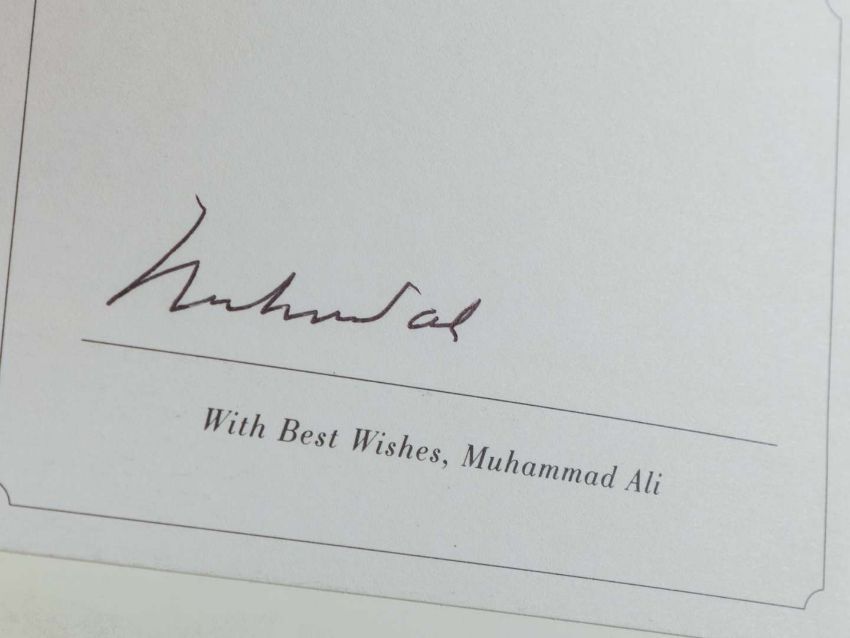 A signed Muhammad Ali plaque and a Muhammad Ali In Perspective by Thomas Hauser, with attached autograph, (2).
