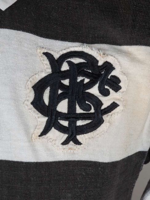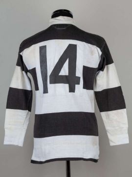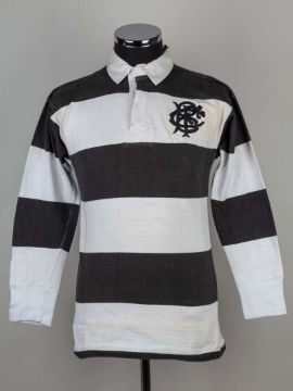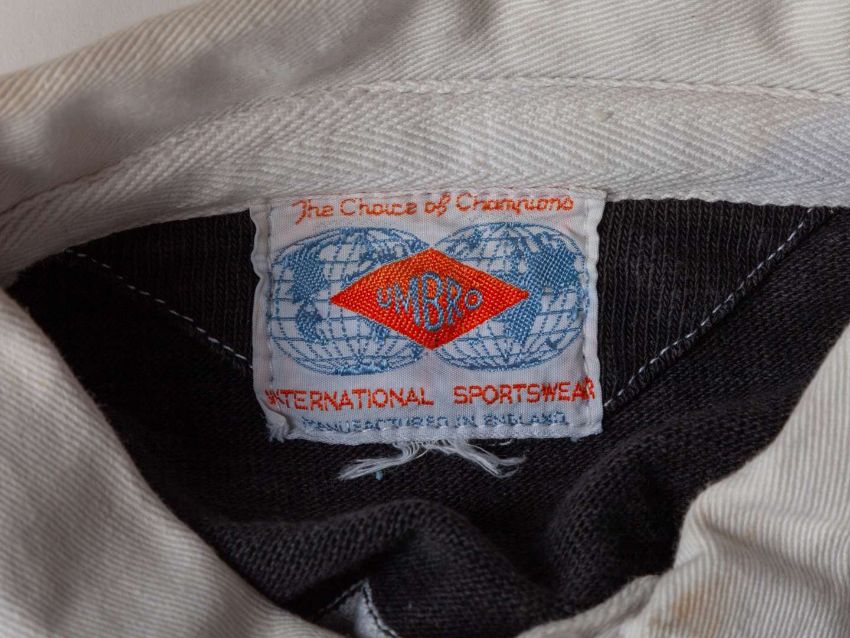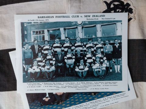 David Duckham black and white No.14 Barbarians v. All Blacks (The Greatest Try) match worn long-sleeved shirt, Umbro, with button-up collar and embroidered cloth badge BFC, areas of staining and pitch wear, with two related prints (3)The above shirt was worn by David Duckham in the famous match where Gareth Edwards scored the arguable The Greatest Try. In the final test match of the 1972-73 tour played on 27th January 1973 at Cardiff Arms Park, The Barbarians defeated New Zealand 23-11.  This item offers an extraordinary opportunity to own a tangible link to an unparalleled moment in rugby history, and would make a remarkable addition to any serious sports memorabilia collection. As a game-worn shirt from one of the most legendary matches ever played, it holds a unique and enduring appeal for both rugby fans and collectors alike. The following lots 106 to 114 relate to the career of David Duckham MBE
