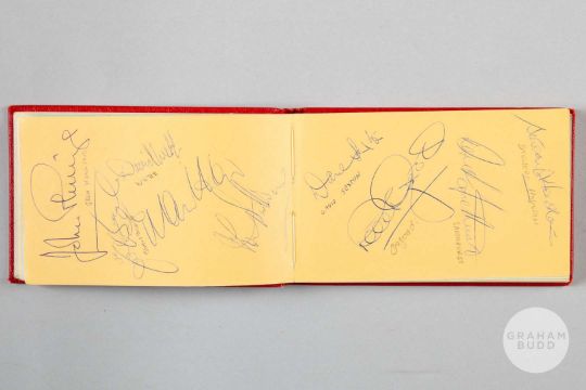 An autograph book containing numerous players and other autographs, including Bobby Moore, Bobby Charlton, Alf Ramsey, Nobby Stiles, Roger Hunt, John Hollins, Dave Sexton, Peter Osgood Charlie Cooke, National Sporting Club menu card, autographed, National Sporting Club menu to honour Sir Alf Ramsey and England World Cup- Winning side, 11th April 1967 at Cafe Royal etc, two glass commemorative plates (a lot)