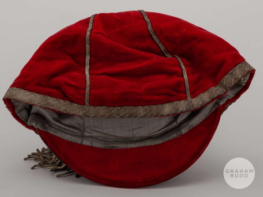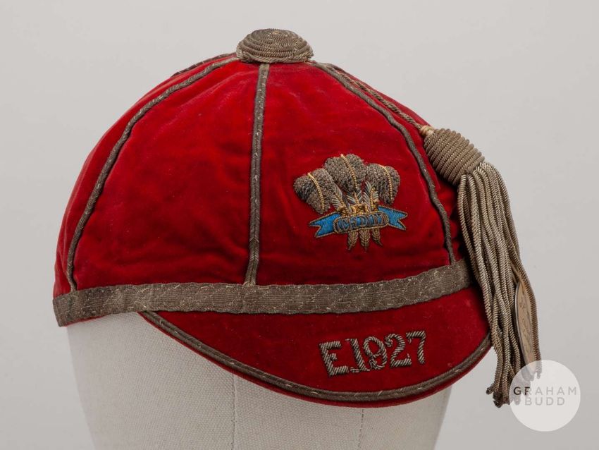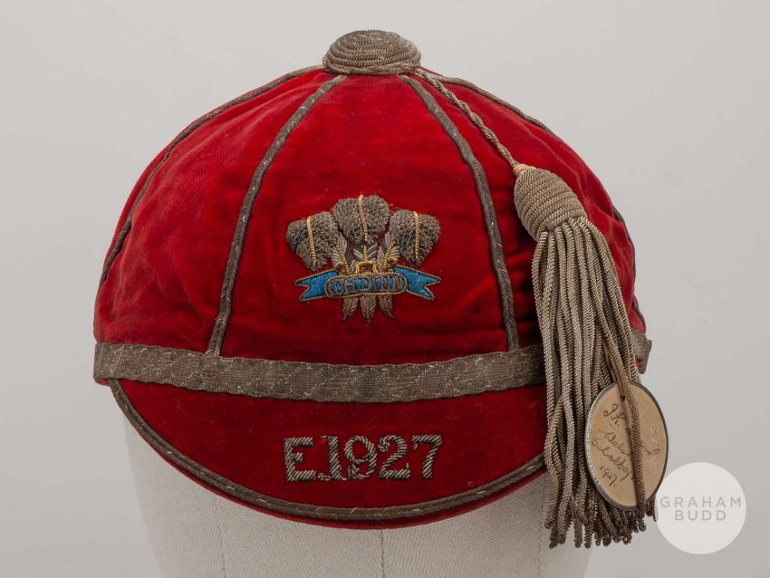 Red Schoolboys Wales v. England rugby international cap, 1927, red velvet cap with silver tassel and braiding embroidered E. 1927 we are unsure as to the recipient of the cap, the tassel does carry a tag with J.R. Evans?