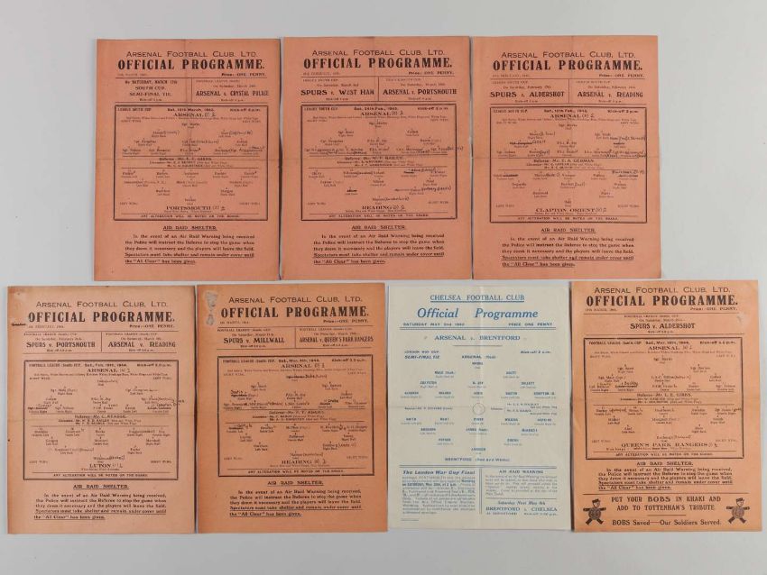 Three Arsenal match programmes comprising Brentford 2nd May 1942, London, War Cup semi-final, Clapton Orient. League South Cup, 10th February 1945 and Luton, League South Cup, 19th February 1944, (3).