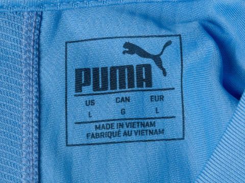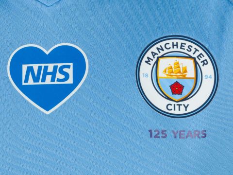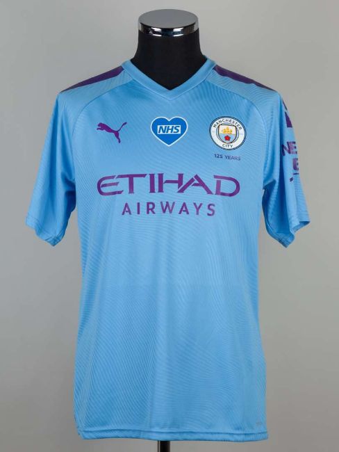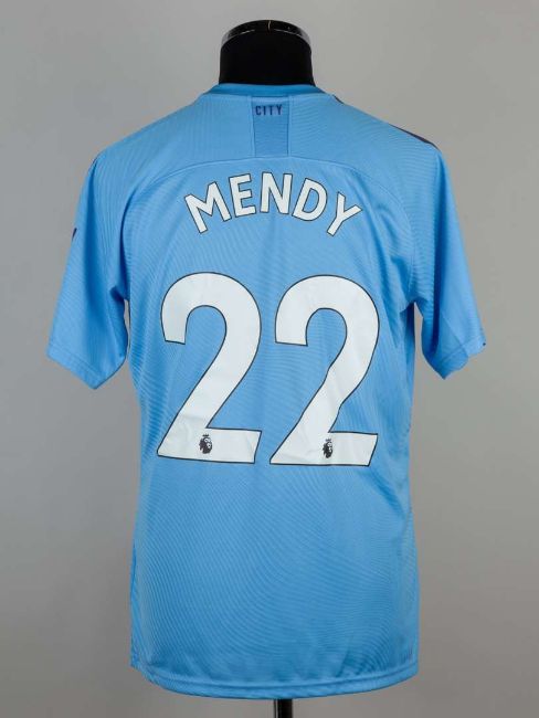 Benjamin Mendy sky blue No.22 Manchester City short sleeved shirt, 2019-20, player issue, Puma, size L, crew neck collar, printed club badge with printed NHS motif, the reverse lettered MENDY with the Black Lives Matter flash on the right sleeve.