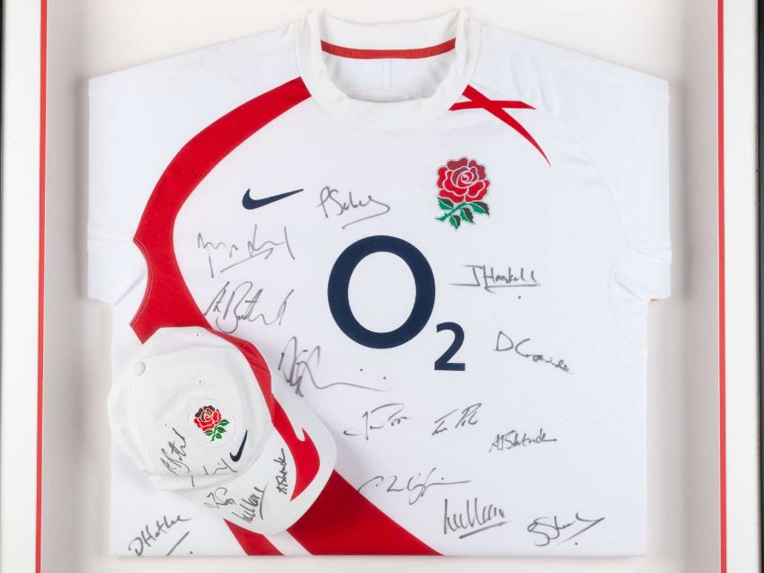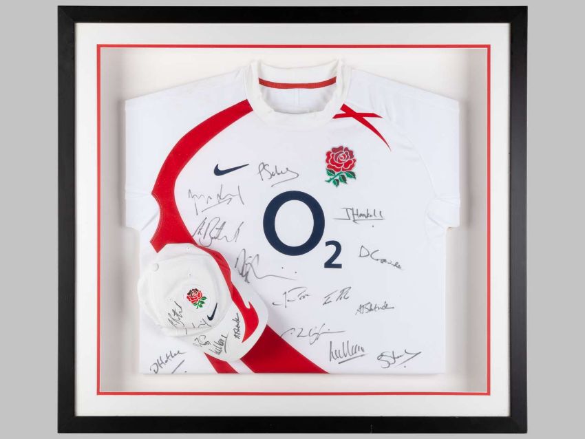 A white England rugby autographed shirt, 2011 and a signed cap, framed and glazed, 76 x 84cm overall The shirt was donated by Stuart Lancaster to "Weetwood Primary School ,Headingley , Leeds" for a fund raiser