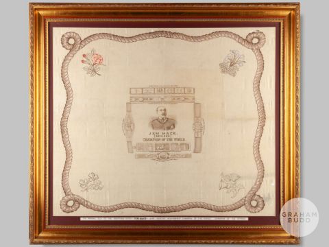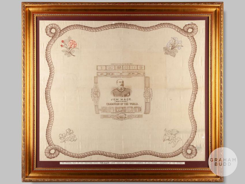 A silk scarf commemorating Jem Mace, printed with a central portrait of the retired champion boxer, surrounded by depictions of his six championship belts, national emblems to each corner, rope twist border, stained, creased and holed, 37 x 42cm overall.