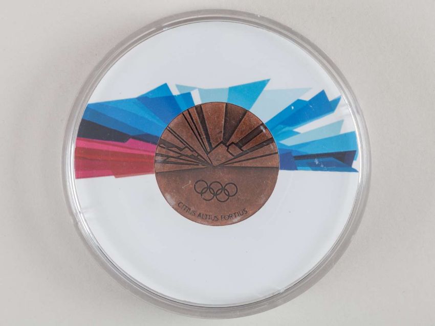 Torino 2006 Winter Olympic Games participant's medal, bronze, obverse with Games emblem, the reverse with Olympic rings over motto, set in colourful circular cardboard, within clear round acrylic case.
