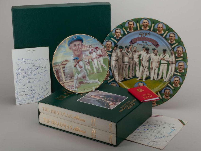 Australian Cricket Board dinner menu, 2nd October 1980, in honour of Sir Don Bradman., the cover autographed by Bradman, back cover bearing numerous autographs including signatures of his wife Jessie and others, Australian Board of Control For International, cricket menu, in honour of the 1971-72 World X1 Touring Team, bearing numerous autographs including Don Bradman and others, 30th December 1971, both. Ex. Sir Geoff Boycott's collection MCC Life Member 2006, Bradman Albums, Vol 1 and 2 and Bradford Exchange plate and ECB blazer, (a lot).