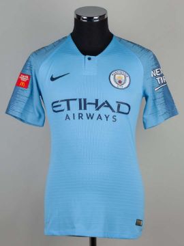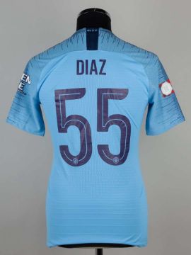 Brahim Diaz sky blue No.55 Manchester City short sleeved shirt, 2018-19, player issue Nike, size M, crew neck collar, embroidered club badge , the reverse lettered DIAZ with the FA Community Shield flash on the right sleeve. The shirt was from the game v Chelsea that took place on August 5th 2018 at Wembley Stadium.
