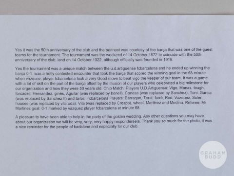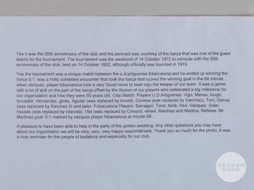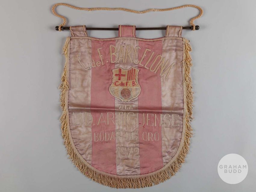 An official Union Deportiva Artiguense v. Barcelona 50th Anniversary match pennant, 1972, embroidered C.deF. BARCELONA UD. ARTIGUENNSE BODAS DE ORO 1972, with club badge, hanging bar, badly faded and stained, 17 x 14in.