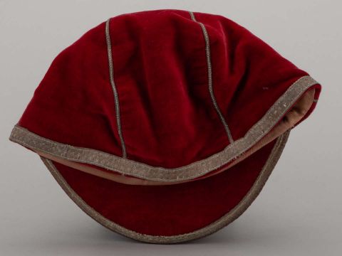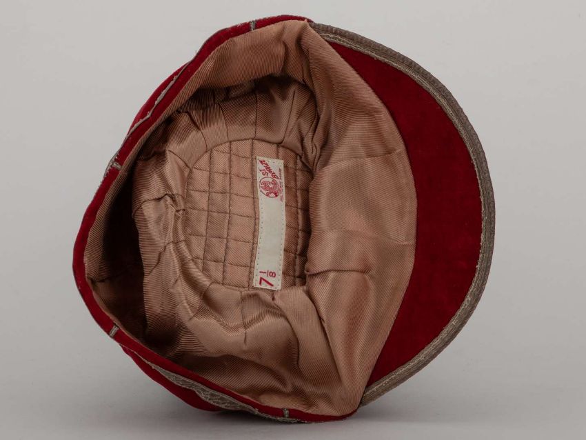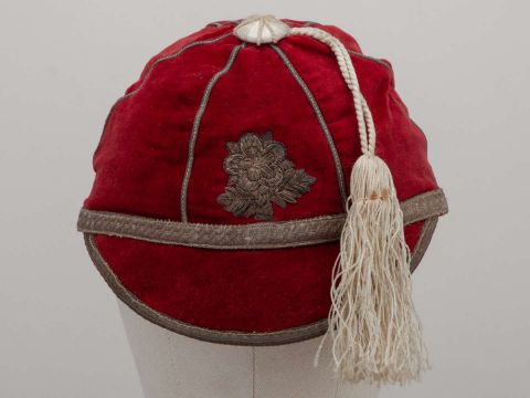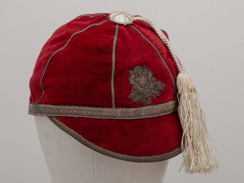 Red England rugby league cap with white tassel and embroidered crest