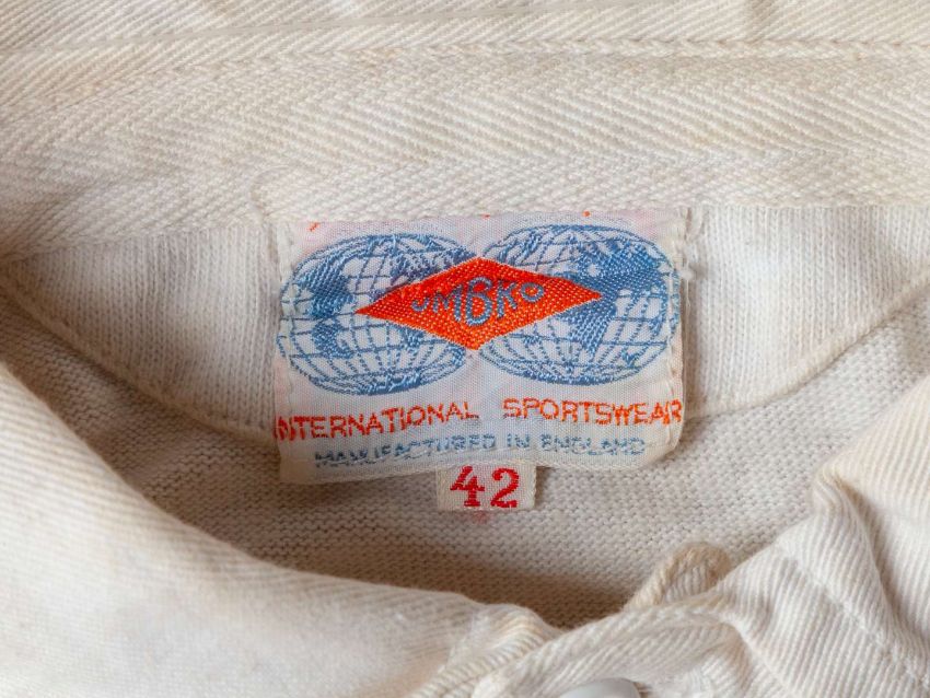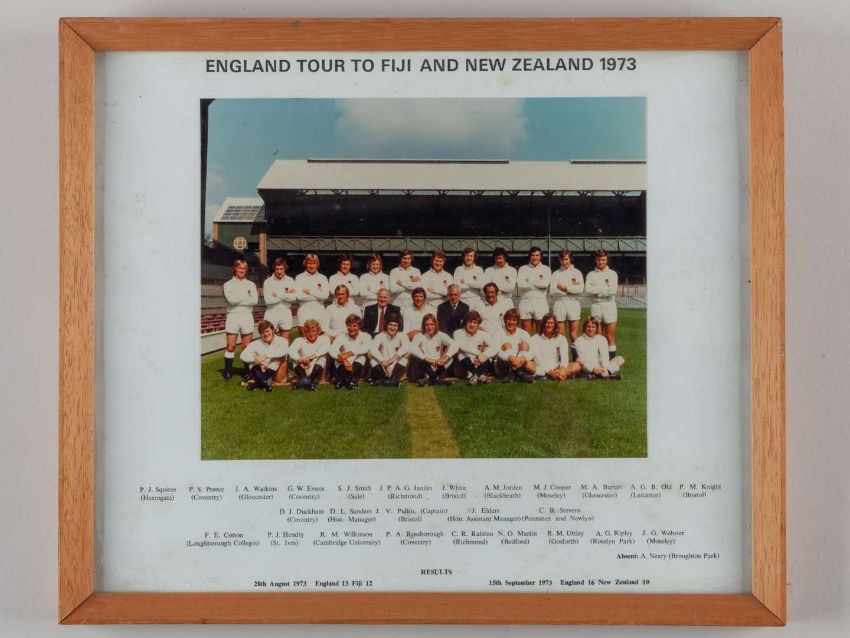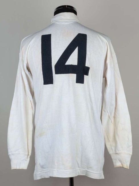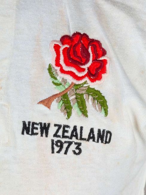David Duckham white No.14 England v. New Zealand match worn long-sleeved shirt, 1973, Umbro, 42, with button-up collar and embroidered badge inscribed NEW ZEALAND 1973, stained with framed print (2) The above shirt was worn by Duckham in the match against the All Blacks played on 15th September 1973 in Auckland, England recording a famous victory winning 16-10 their first win against the All Blacks since 1936 The following lots 106 to 114 relate to the career of David Duckham MBE