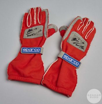 Pair of Mika Salo race used autographed Sparco gloves, each gloved signed, inscribed and dated Monaco - 02, with ISO 6940 labels.