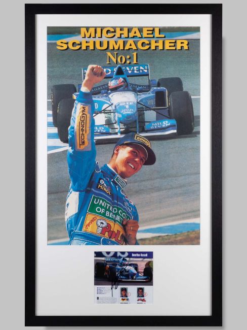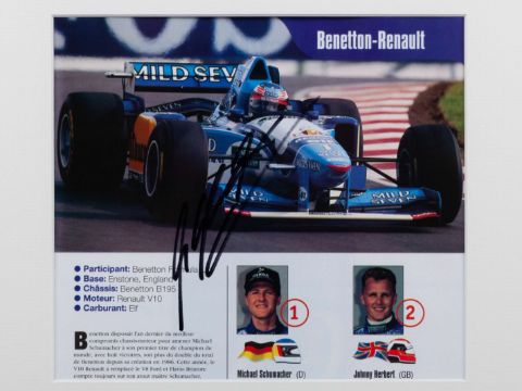Michael Schumacher No:1" Benetton Team Formula One poster featuring the B195 race car mounted with autograph, the signature was collected at the Spa Belgium Grand Prix 27/8/1995, 122 x 74cmThe B195 Benetton was raced by Michael in the 1995 season.