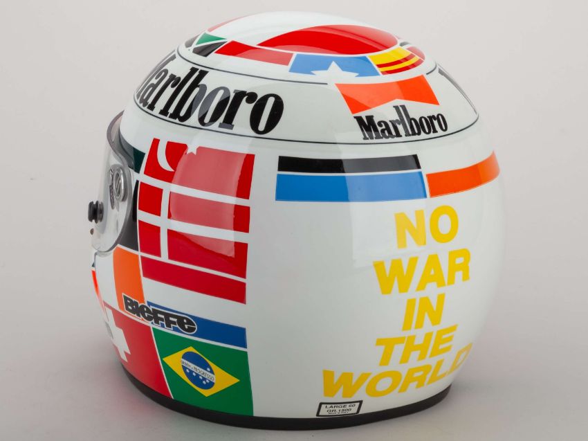 A Gerhard Berger Bieffe replica helmet with sponsors logos and No War in The World decal with flags of nations