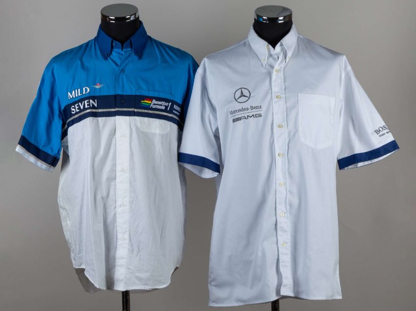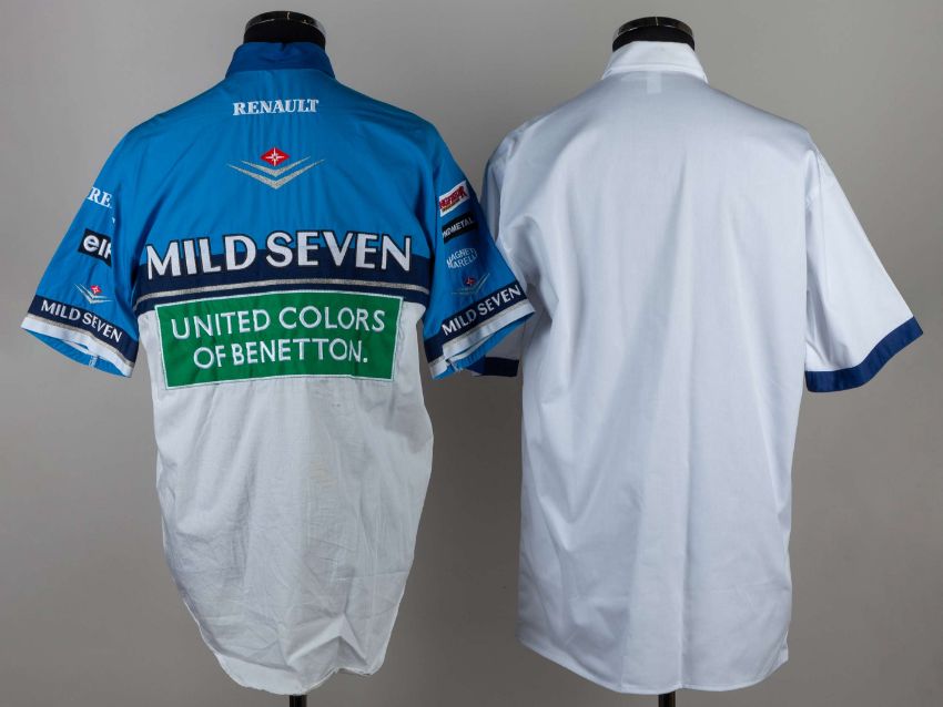 A Benetton F1 pit crew shirt with sponsors logos and Mercedes Benz example, (2).