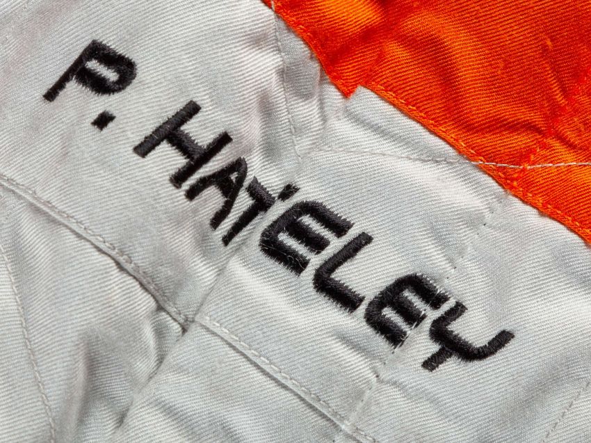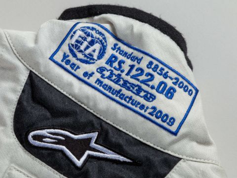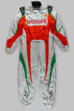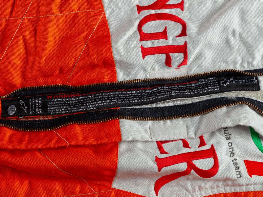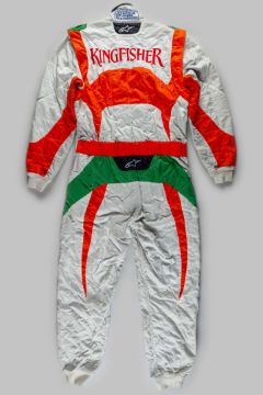 An original pit crew suit as used by a Force India team mechanic in the 2009 F1 season when the team drivers were Giancarlo Fisichella, Adrian Sutil and Vitantonio Liuzzi, the suit has the mechanics name to the belt and is a size 56, stained, in used condition.