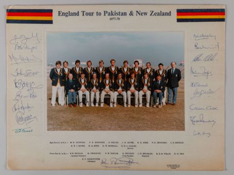 1977-78 M.C.C. Cricket Tour to Pakistan and New Zealand signed team photograph, original official squad photograph prepared for players and officials only, laid down to original photographers mount by Allied Photo CoBristol Photo of Bombay, with team legend and team members details, neatly autographed by the full squad including Brearley, Boycott, Gatting, Botham etc, 34 x 45cm