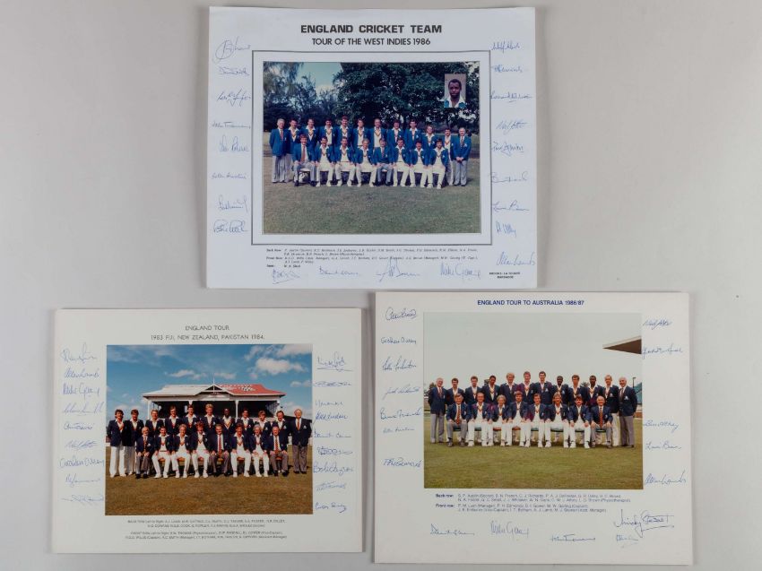 Three M.C.C. Cricket Tour to signed team photographs, comprising Fiji, New Zealand and Pakistan 1984, West Indies, 1986 and Australia 1986-87, original official squad photographs, laid down to original photographers, with team legend and team members details, neatly autographed by the full squad, 33 x 38cm and smaller, (3)