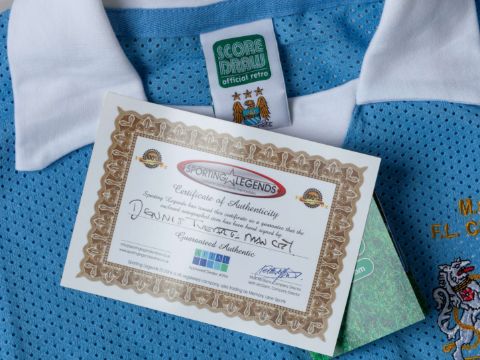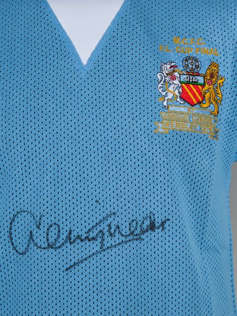 An airtex Manchester City replica 1976 League Cup Dennis Tueart autographed shirt with Sporting Legends COA