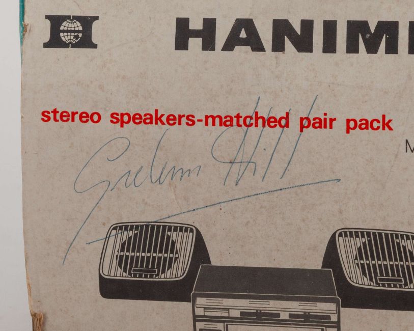 This unique piece of automotive memorabilia features a Hanimex CR4 car radio, famously autographed by the legendary British racing driver, Graham Hill.