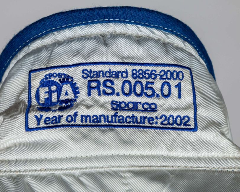 The FIA embroidery on the top back of the suit reads: Standard 8856-2000. RS.005.01. Year of manufacture: 2002.