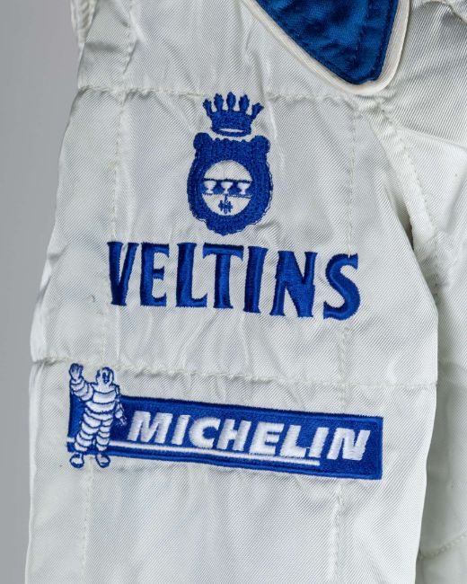 Crafted by Sparco, the suit showcases the BMW Williams F1 Team's iconic blue and white livery, with the team’s sponsor logos displayed throughout.