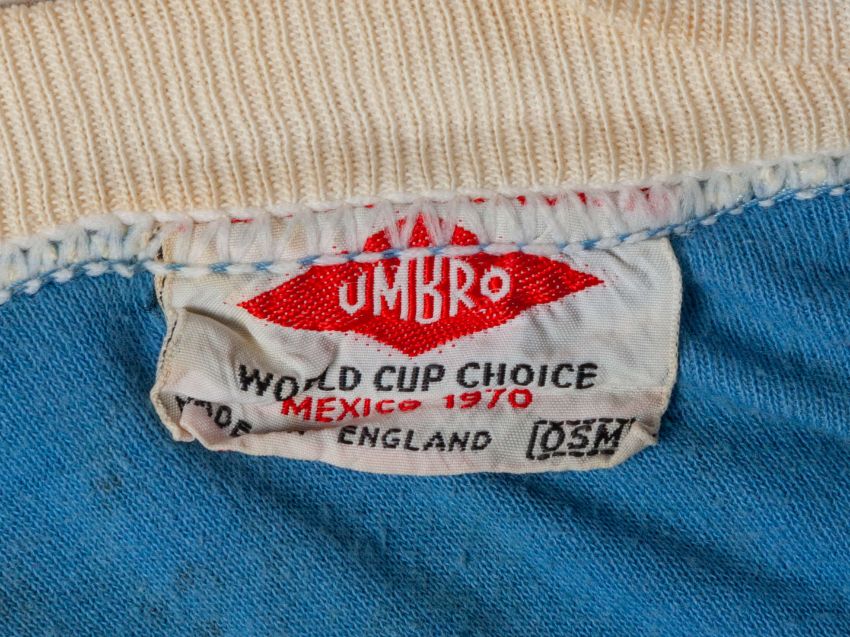 Denis Law sky-blue and white No.9 Manchester City v. Birmingham City match worn long-sleeved shirt, 1973, with crew-neck collar with embroidered badge inscribed MANCHESTER CITY F.C., hole to the side of shirt, staining and some discolouration
