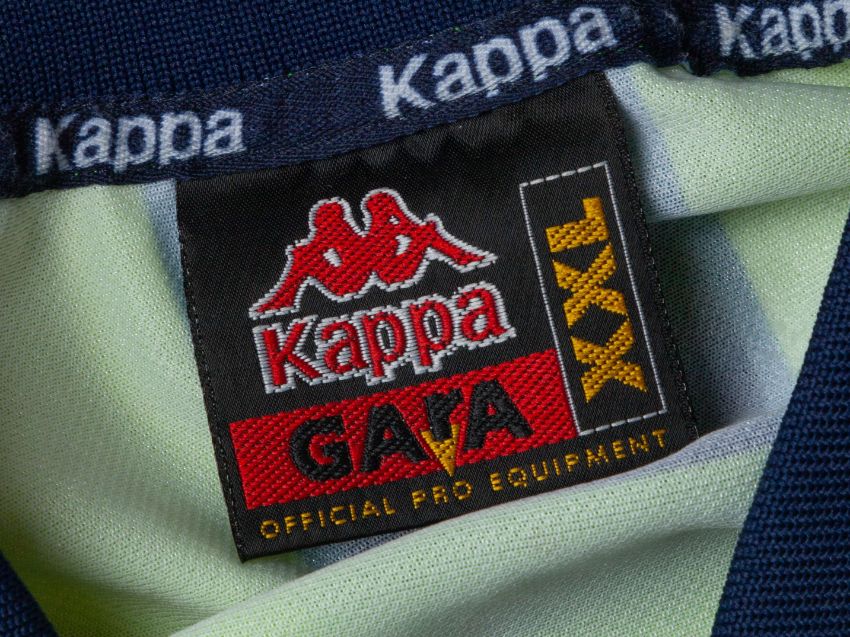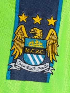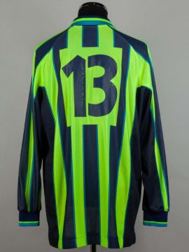 Tony Vaughan yellow and navy No.13 Manchester City v. Gillingham match worn playoff final long-sleeved shirt, 1999, Kappa, XXL, with v-neck collar embroidered badge inscribed M.C.F.C., number shows signs of wear