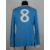 Colin Bell blue and white No.8 Manchester City long-sleeved shirt, 1973-74, Umbro, with crew-neck collar embroidered MANCHESTER CITY F.C., holes to both sides of the shirts with particular frequency around stitching and a split to the bottom of number, damage and repair to left sleeve