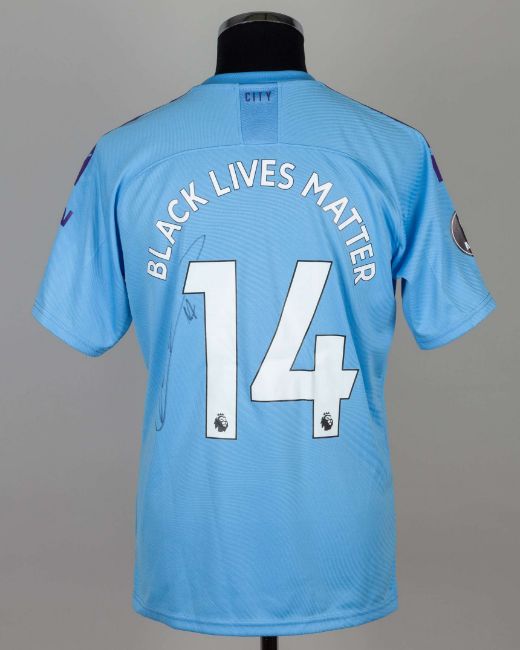 Aymeric Laporte sky-blue and purple No.14 Manchester City v. Arsenal match worn short-sleeved shirt, 2020, Puma, L, with v-neck collar and printed badge, with 125 YEARS and NHS decal, the reverse lettered BLACK LIVES MATTERS, the reverse also autographed by Laporte, with Choose Cityzends Giving For Recovery logo