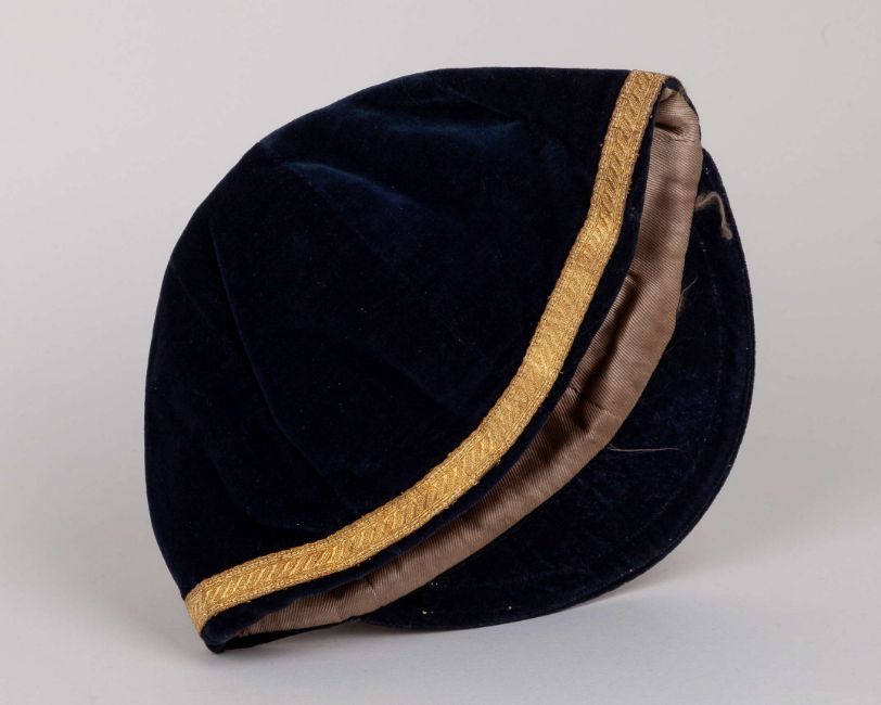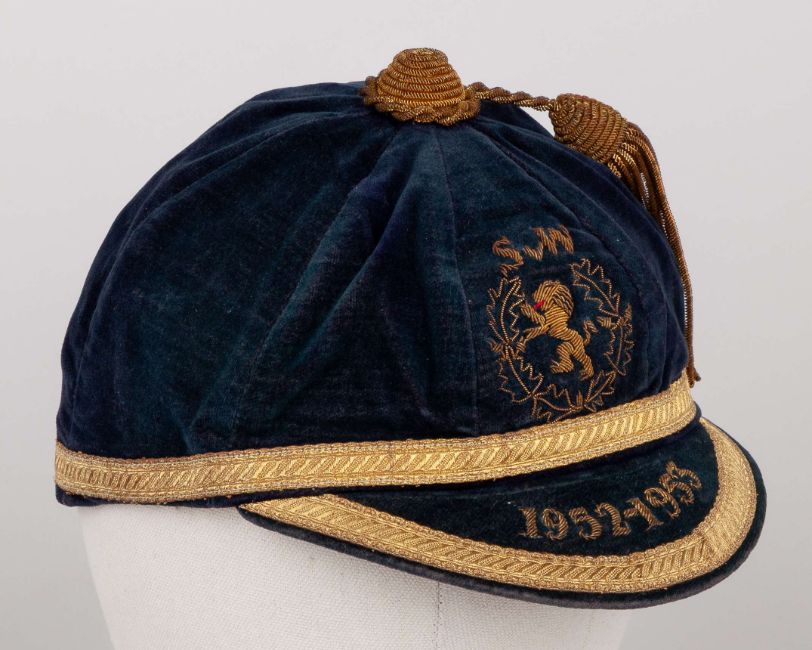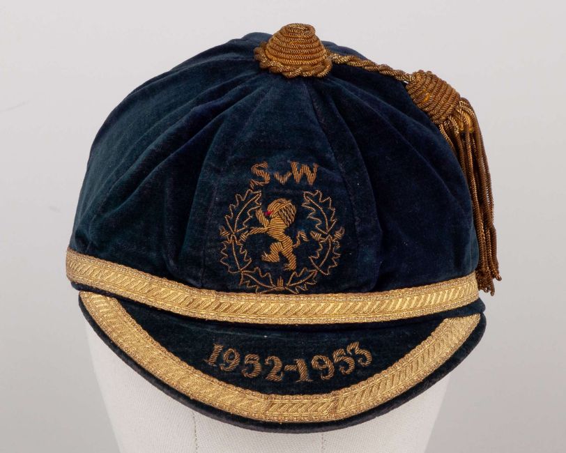 Allan Brown blue Scotland v. Wales International Cap, 1952-53, blue velvet cap with gilt tassel, gilt braising inscribed with crest S v W, 1952-53