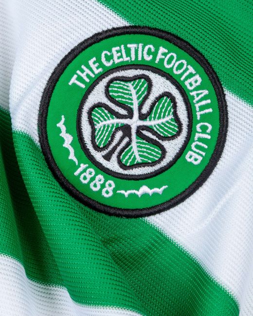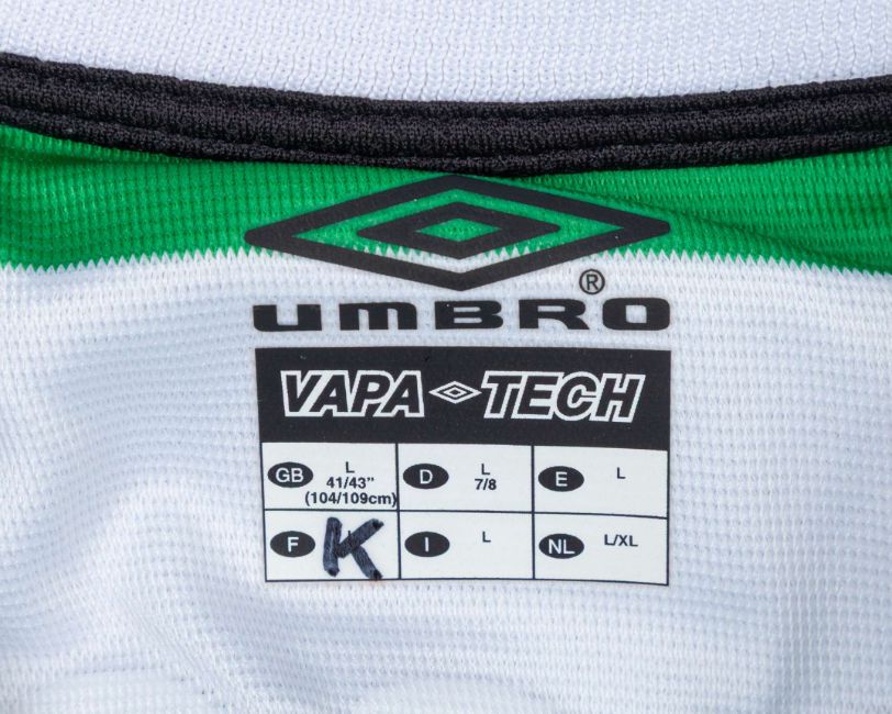 Henrik Larsson green and white No.7 Celtic short-sleeved shirt 2002-03, Umbro, L, with v-neck style collar and embroidered cloth badge, inscribed THE CELTIC FOOTBALL CLUB 1888, the reverse lettered LARSSON, Scottish Premier League flashes, the number worn