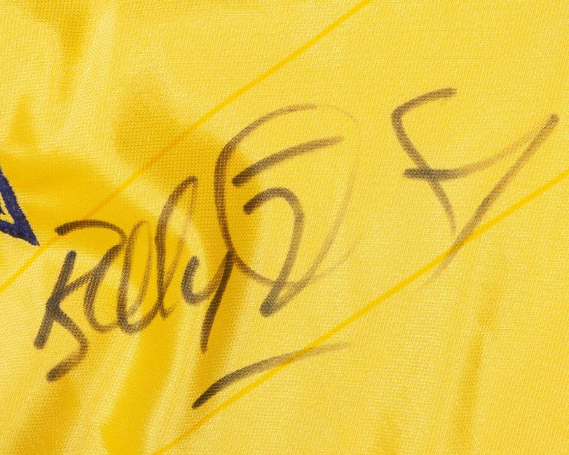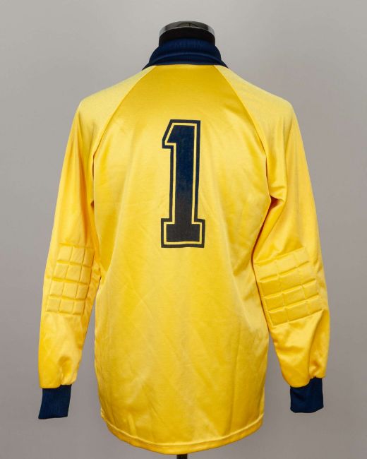 Billy Thomson yellow and blue No.1 Scotland v. Northern Ireland goalkeepers shirt, 1981, Umbro, Large, with crew-neck collar and embroidered badge inscribed THE SCOTTISH FOOTBALL ASSOCIATION, the front of the shirt autographed by Billy Thomson