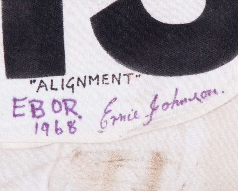 signed by the winning jockey Ernie Johnson and inscribed “ALIGNMENT”, EBOR, 1968, white cloth with black No.19