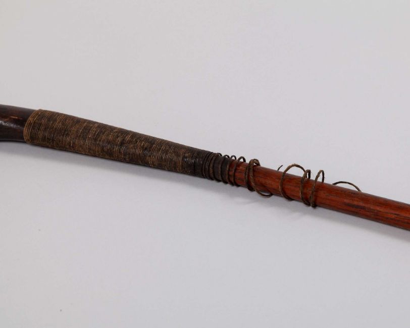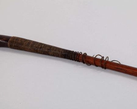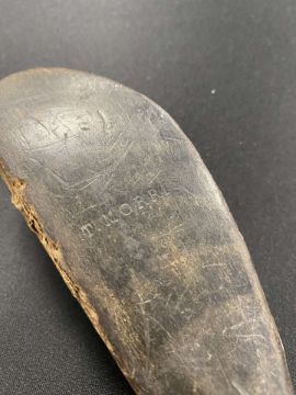 A scared-head long-nosed putter by Tom Morris, the head stamped T. MORRIS, with ram's horn insert and lead weight, wear to club face, with suede grip, 93 cm long to base of shaft