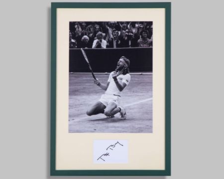 Bjorn Borg signed 1980 Wimbledon framed photograph presentation, 16 by 12in. b&w photograph depicting Borg at the moment of victory over John McEnroe in the 1980 final, mounted above his signature in black marker on white card, framed under Plexiglass, 61 by 43cm
