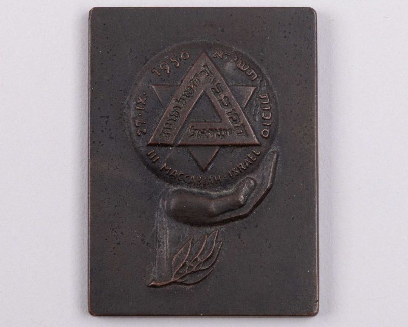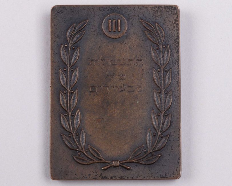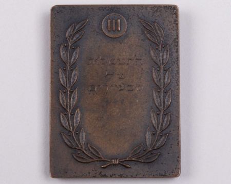 Bronze Maccabiah III 1950 third place gymnastics winners medal the obverse inscribed in Hebrew and England III MACCABIAH - ISRAEL 27 XI 1950, the reverse with a laurel wreath and inscribed III, with further Hebrew text, 5cm. high