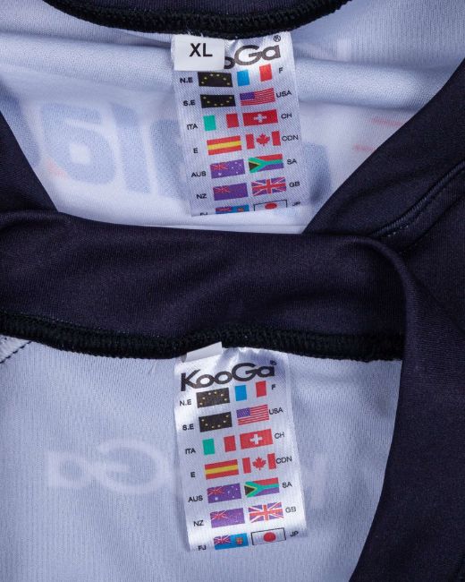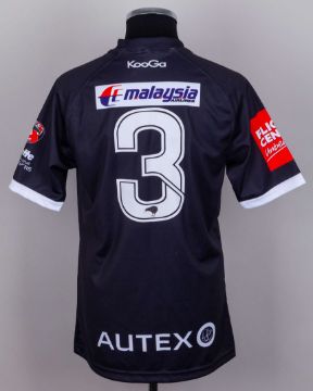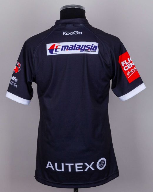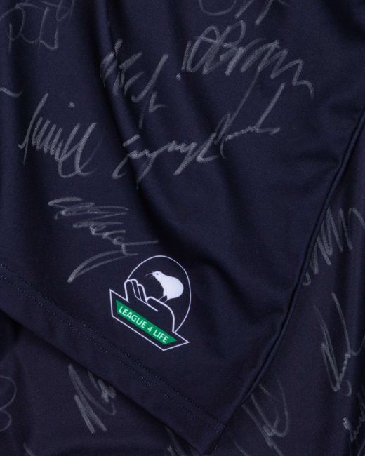Two black and white New Zealand Rugby League autographed short-sleeved shirts, KooGa, with embroidered cloth badge inscribed NEW ZEALAND KIWIS, FOUR NATIONAS, the front bearing over twenty autographs (2)