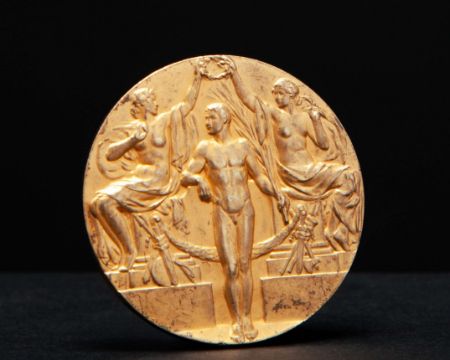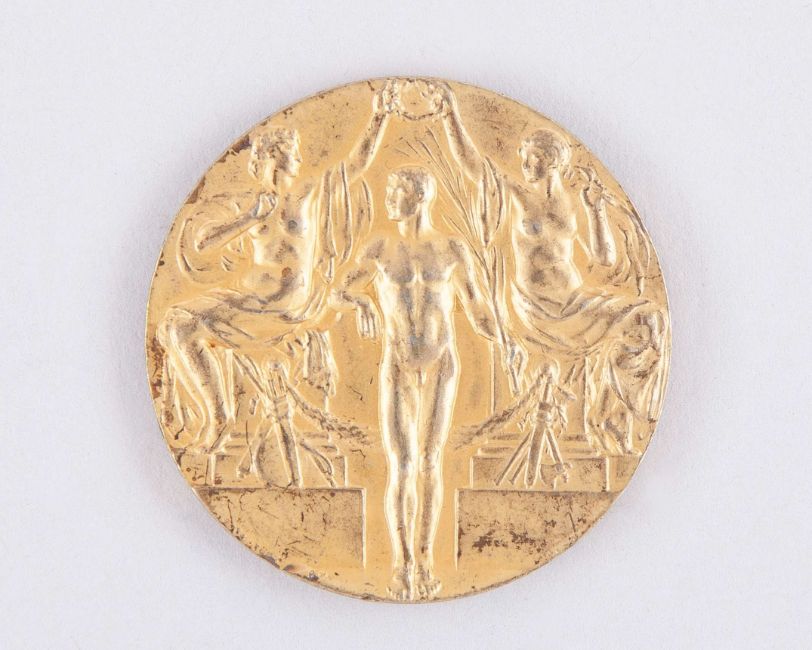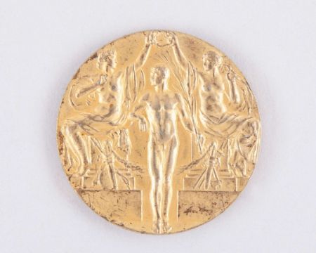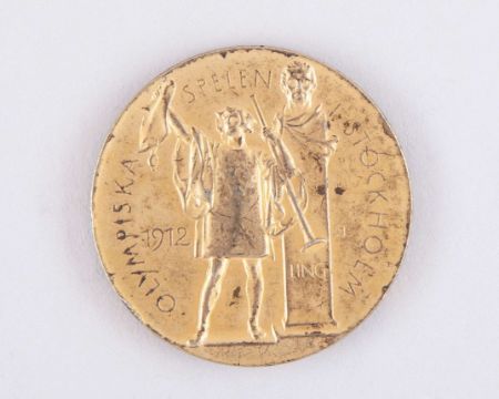 Joseph Dines a rare 1912 Olympic Football gold medal, struck in silver-gilt (as usual for 1912 1st Place team awards), designed by Erik Lindberg and Bertram Mackennal, two maidens crowning a victorious athlete, the reverse inscribed OLYMPISKA SPELEN STOCKHOLM, 1913, 35mm, surface scratches and some rubbing