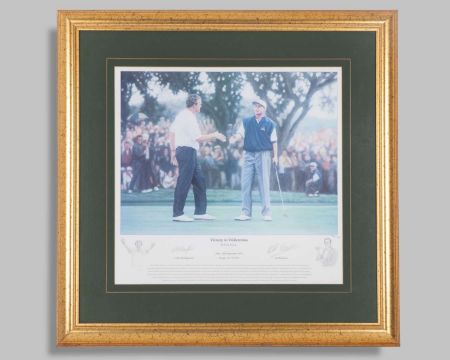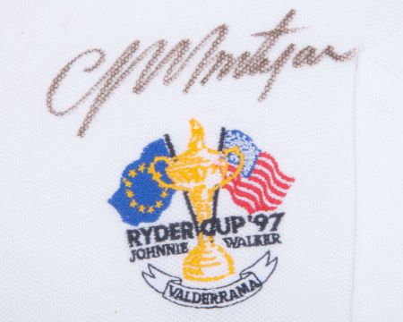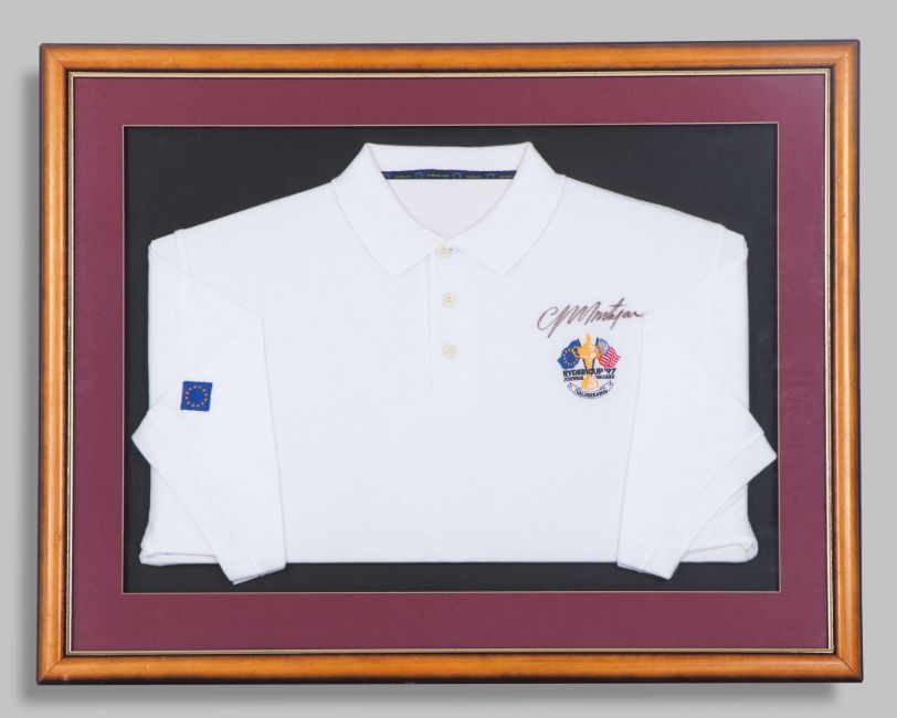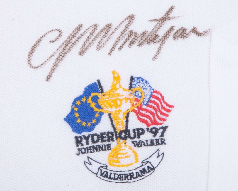 Colin Montgomerie autographed white Ryder Cup 1997 Valderrama Polo shirt, Glenmuir, with button-up collar and embroidered badge inscribed RYDER CUP 97 JOHNNIE WALKER VALDERRAMA, the right sleeve with embroidered EU flag, autographed above the badge by Colin Montgomerie, framed and glazed, 79 x 62cm and Victory in Valderrama by Keith Fearon autographed limited edition print, 96 of 495, with two autographs including Colin Montgomerie and Keith Fearon, framed and glazed, 69 x 68cm (2)
