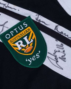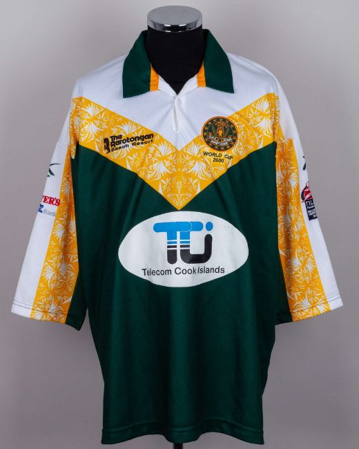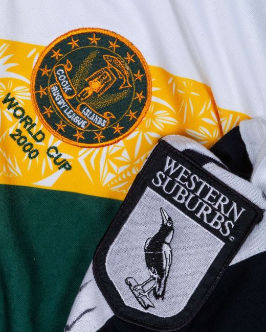 A black and white Western Suburbs rugby league autographed shirt, bearing thirteen autographs and a Cook Islands 2000 World Cup rugby league shirt (2)