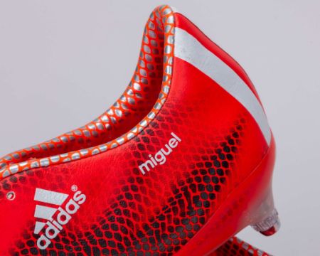 Jordi Alba red Adidas F50 Champions League issued football boots, 2014-15, with jordi alba david decal on the left boot and maria jose miguel decal on left boot