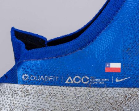 Arturo Vidal blue Nike Phantom SN match worn football boots, November 2018, UK8, with ALONSITO 07/05/2009 (Chile flag) decal on both boots, with signs of wear